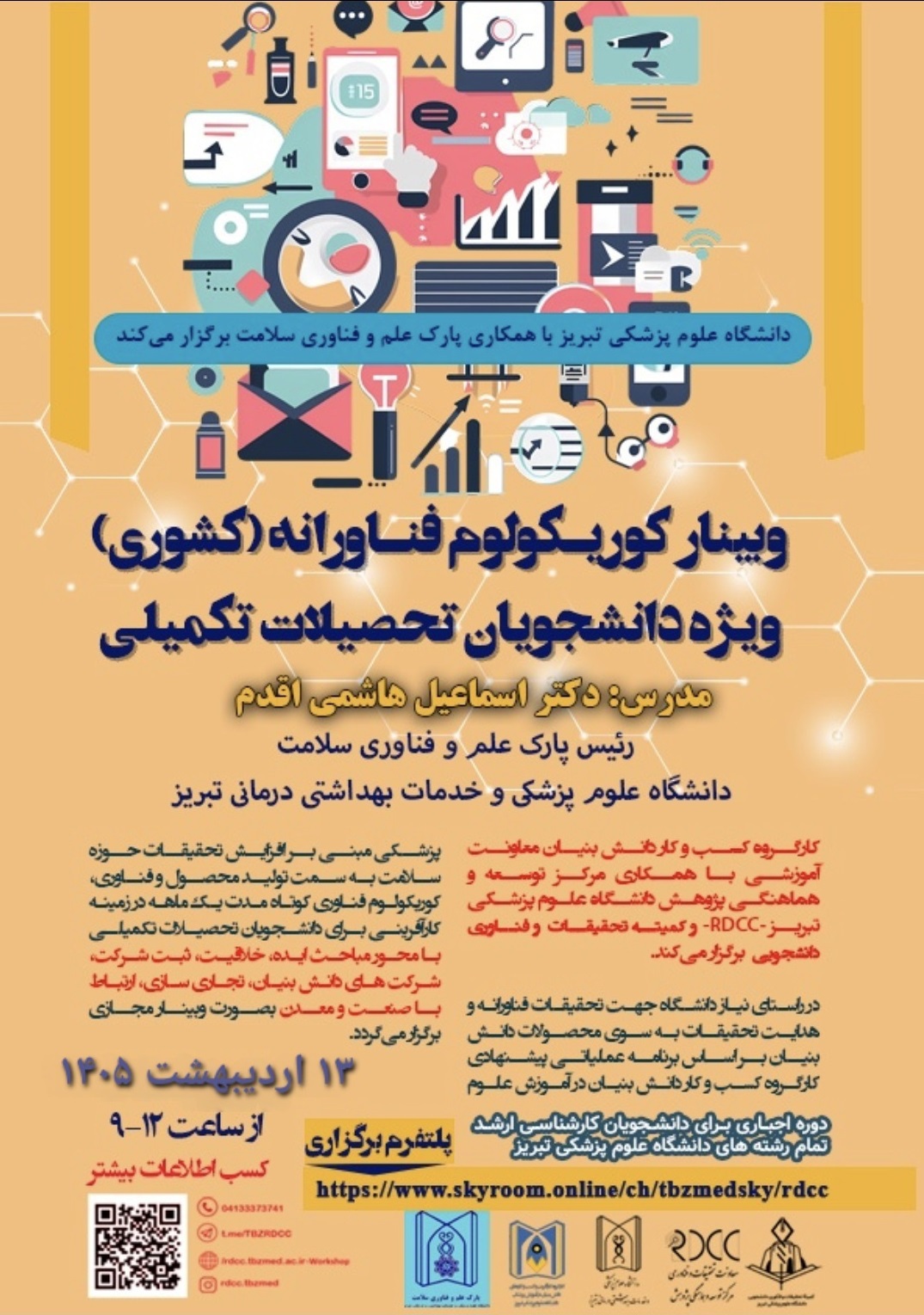 این کارگاه روز یکشنبه ۱۳ اردیبهشت ماه ۱۴۰۵ از ساعت ۹ تا ۱۲ توسط مرکز توسعه و هماهنگی پژوهش (RDCC) و کارگروه کسب و کار دانش بنیان معاونت آموزشی دانشگاه علوم پزشکی تبریز به صورت مجازی برگزار میگردد.